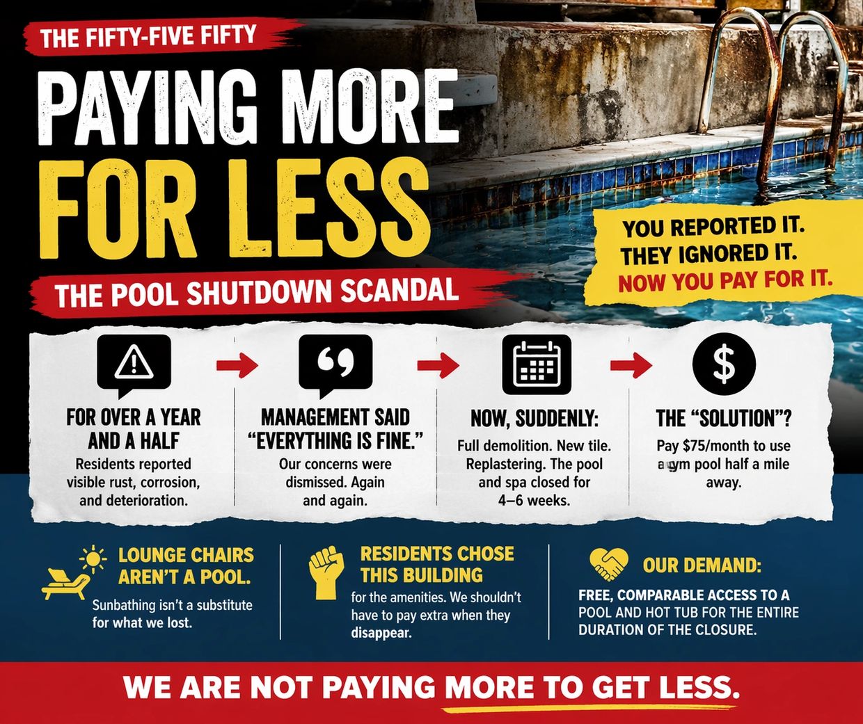 For over a year and a half, residents at The Fifty-Five Fifty have been raising the same issue: the pool and hot tub were visibly deteriorating. Rust, corrosion, and clear signs of neglect were repeatedly reported.